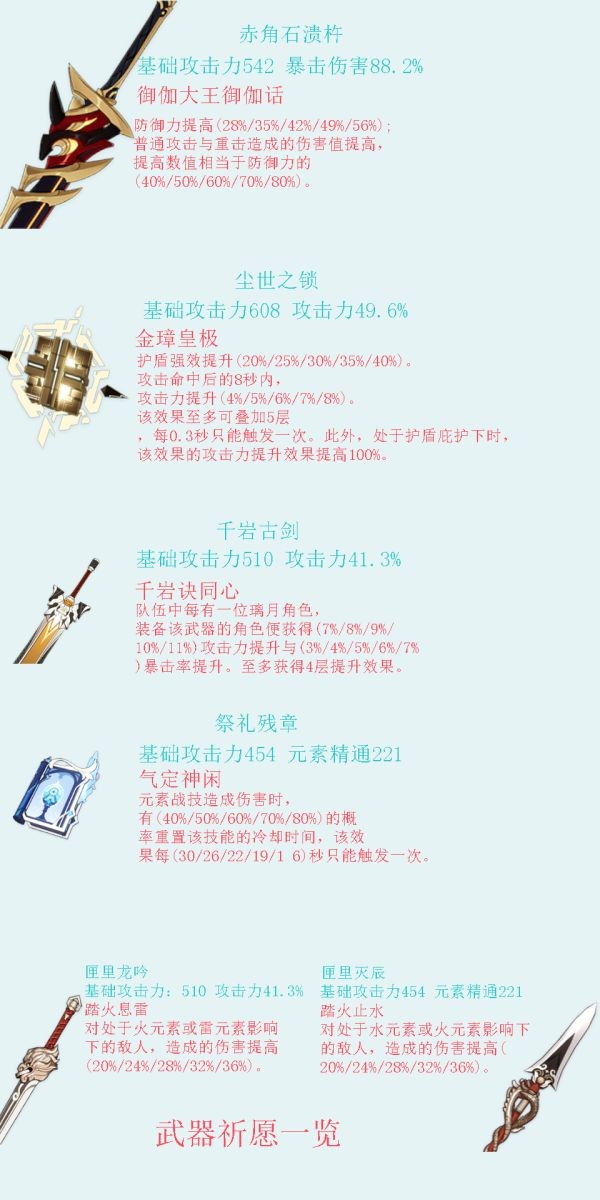 四星双手剑,510攻击力和41.3%攻击力加成,武器根据璃月角色提高暴击率。武器上限比较高,但是需要璃月角色,所以携带该武器角色最好本身是璃月角色。目前璃月双手剑重云、北斗、辛焱。但北斗在常规配队都是充能武器绝缘套,所以千岩古剑目前只比较适合重云的使用。