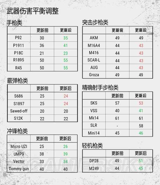 稍微减少了M16A4、SCARL、AUG和M416的伤害量。
