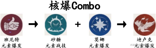 辅助增伤(“猴戏”)阵容能够在短时间内造成超高的伤害,而莫娜、砂糖、班尼特是辅助增伤幅度最高的,且迪卢克大招能在短时间内附着至少两次的火元素,使莫娜大招高倍率的第二段伤害打出两倍的蒸发伤害,效果堪称“核爆”。