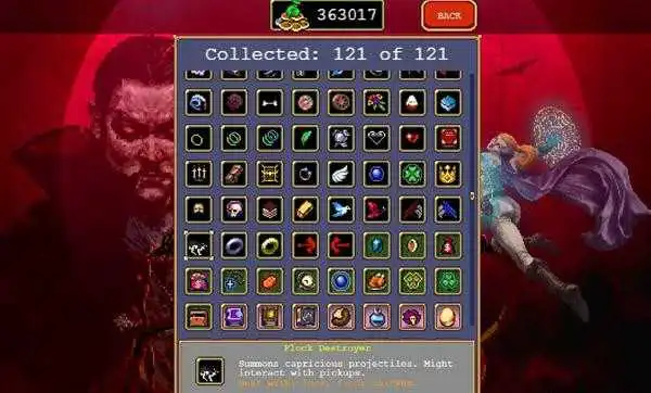 如果你和我一样有2个道具一直没解锁,其中一个大概率是6号隐藏角色Big Trouser的武器Candybox(解锁方法下文会有),另外一个是猫咪Flock Destroyer,选择猫咪武器Gatti Amari配合塔罗牌I-Gemini开一局游戏就可以解锁啦。