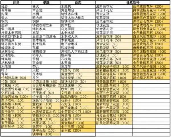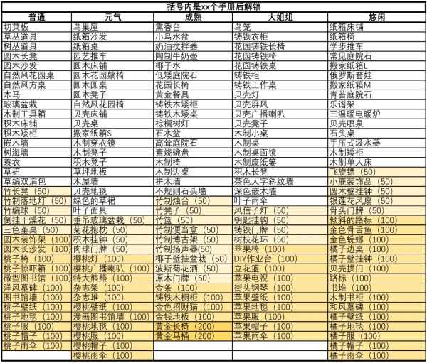 不同性格的小动物教的DIY手册也不一样,具体如下,括号内的数字是需要学到这个数量的手册才能解锁。