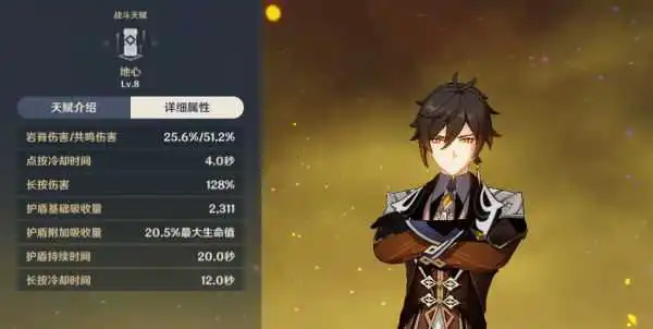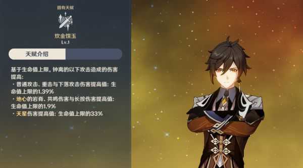 这一天赋极为重要,大幅度提升了钟离的输出能力。以3w血量的钟离为例,共鸣伤害基础值为570,相当于2000攻击力钟离28%的倍率,天星伤害基础值为9900,相当于2000攻击力钟离500%的倍率。天赋8级时,共鸣倍率为51.28%,天星倍率为770%,这个提升的幅度不可谓不大。(通常攻击力不会达到2000)