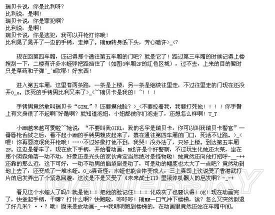 就在这个5车厢的2F,除了楼梯还有两个通道,一个是楼梯背后的门,进不去,先不管,另一个是车厢尽头的天窗,爬上去!爬!!!!没错^_^外边下着雨,怎么样,很棒吧。如果是在夏天的话-__++现在我们正在第五车厢的最顶上顶着雨慢慢地弯腰行走。车子开的很快啊,所以不能奔跑(真的!)也不要走到边上小心掉下去(假的),走到头,建议大家控制瑞贝卡(放心,我不会害你的^_^),把尽头的电源接通,对,现在五车厢一层的那个门可以进去了。不过,突然电线堆里,有水流出来了,然后是一大群水蛭冲出来,哇卡,瑞贝卡从车厢顶上的大洞掉回五车厢2F那个楼梯背后进不去的房间里了,这下好嘛,不用找钥匙了,手铐比利是下不去的。等瑞贝卡出来吗?不,那个门从里边也开不了,从外边也开不了,非要找一个锥子才能弄开。现在先用瑞贝卡搜索一下这个房子,暂时被困在这里了,房子里有把钥匙,拿起来放进墙角传递食物的小升降口然后按一下,把这个要是传到一楼去,现在控制比利回到5车厢1层,是1层哦!不是2层!^_^#进楼梯边上刚才进不去的门,那里面是厨房,进去后往右边有个小走廊,尽头是小升降口,在那里拿出瑞贝卡传来的钥匙!温暖啊!T_T可爱的小MM。现在让我们和手铐兄一起同舟共济吧!冲!!冲向第二车厢,路上会有些丧尸,都不要打!啊?为什么不要打?0_o你要打我也没意见,我随便说说的。冲到2车厢后,在那个STARS破窗男死的走廊上有个门不是前面进不去么?现在有钥匙了,进去,搜刮,最重要的是公文包,拿着,然后按门后边的按钮,下来一个梯子,爬上去吧^_^#上边是2车厢2F,什么也没有,不用害怕!^_^#什么?你说听见响声了吗?没关系,那是一个可爱的小BABY在车顶上洗澡。走吧走吧,走到尽头开门,你就到了3车厢2F,在走廊上搜刮一阵,然后进唯一能进的门,搜刮一阵,锥子别忘记拿了。再出来原路返回到2车厢2F,这时候在车顶上洗澡太久的BABY终于下来了,0_o是只外强中干的蝎子。不要跑远了打,就冲到它面前,向下打它的头,打一下它会退很远,瞧,多可爱,打死为止+_+。捡起地上的铁钩,然后回到5车厢1层的那个升降口,把锥子传给小MM。然后亲自去2F迎接吧,小MM就可以出来啦!耶!逃出生天。^_^#辛苦手铐兄了。相信大家宁愿手铐兄辛苦,也不愿意把他关在这房子里吧。总得给他一个英雄救美的机会啊!