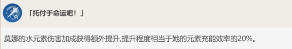 【额外水伤】:在泡影解除时会造成一段水元素伤害,莫娜Q的倍率很高,所以在配装时不要仅仅将莫娜当作一个工具人。