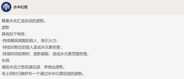 【泡影】:释放后会给所有的怪物加上一个泡影,同时造成一段水元素附着,作用就像深渊水法师的泡泡一样,会将体重较轻的小型怪禁锢住,对大型怪没有任何效果