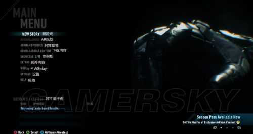 额外内容:查看故事纲要图片、查看游戏原画(需要完成流程进度才能够解锁)、查看《蝙蝠侠:阿甘之城》的制作组。