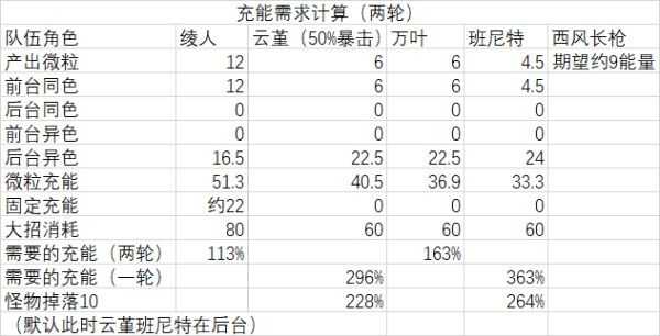 实战中大部分怪物都会掉落微粒。从表格中可以看出,为了让第二轮爆发能够扩散到第一次大招的水要求循环紧凑,「绫人」本人只需要一点充能属性即可自洽,反而是「云堇」和「班尼特」两位每轮都需要开大的辅助对充能要求相当高,在短轴中他们没有什么额外时间打E攒能量。遇到完全不掉落微粒,而且无法一轮带走的怪物,推荐把「班尼特」替换为「行秋」/「钟离」,前者能稳定提供水扩散,后者自身没有充能需求,还能缓解「云堇」的充能压力。
