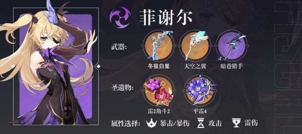 如果「云堇」的练度较低,而有满命「菲谢尔」时也可以替换这个位置,可以一定程度上弥补「绫人」对单伤害疲软的问题。「菲谢尔」6命能够让「奥兹」联动场上角色的普攻打出额外伤害,触发的次数取决于「绫人」的攻击频率。此外,让风辅助同时扩散水和雷两个元素操作起来比较简单。