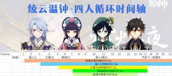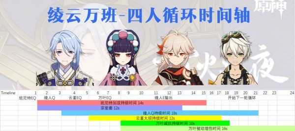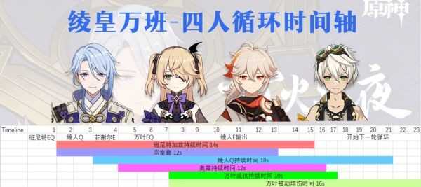 「绫人」的循环轴很短,做完整套流程只有15秒,而大部分主流阵容所需时间都在20秒左右。这就意味着尽管「绫人」在单轮总伤方面不算优秀,但他的启动速度较快,且在多轮循环中更有优势。一般来说,技能的持续时间越长就应该优先释放。不过「绫人」的大招锁面板,即使时间最长也可以在「班尼特」圈内释放,也有利于下一轮循环让「万叶」吃到这个大招的“尾气”再次触发扩散,达成一个大招两轮利用的效果。以下阵容建议非固定,各辅助角色可自由变换,如果有更好的阵容欢迎补充。