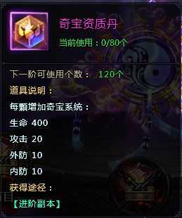 (2) 奇宝进阶丹允许使用元宝以及绑元在御街进行购买,并且可使用荣誉兑换,参加江湖巨寇等活动获得。