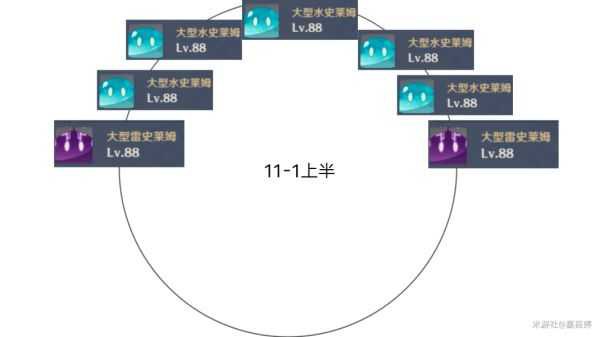 刚开始进去可以看到7只史莱姆,如上排列,因为11层整体雷环境,十分不推荐内鬼如芭芭拉等角色。