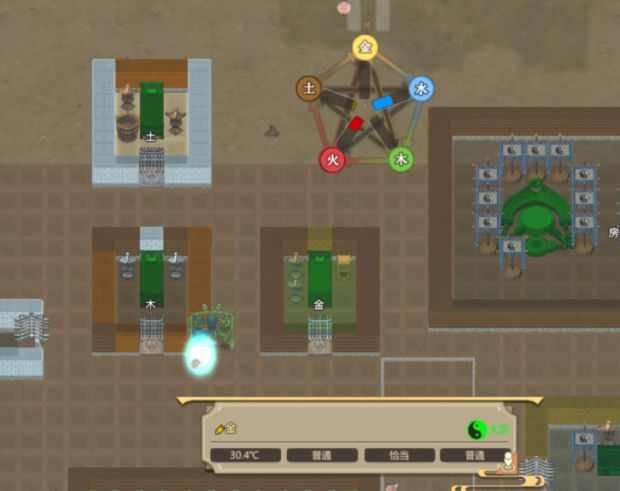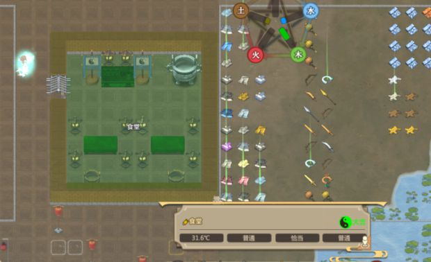 炼丹炼宝,门朝右,用土做成的丹炉和炼宝台,周围放6-8个火属性旗子,可以先建5个,然后慢慢加一直加到两个都评价大吉为止。两个放一起是图方便,而且房间大夏天温度会低一些,这个房间夏天四十多度也挺热,介意的可以把墙壁换成寒晶,不换也死不了人的。