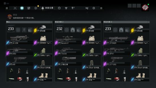 设置好预设方案2,预设方案3,如下图。只要弹药和弹夹容量相同,可以更换枪的种类,必须要“狙击步枪扩容弹夹”和“轻机枪扩容弹夹”以及解锁“身强力壮”特长。