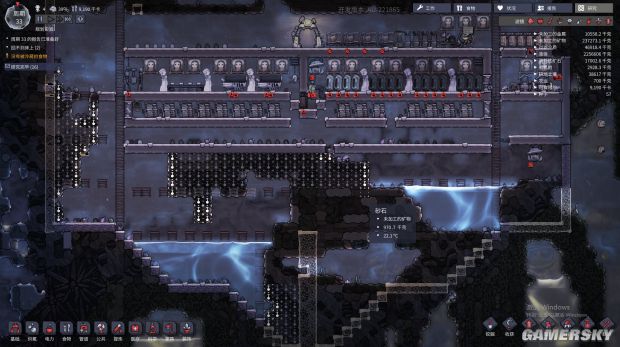 这里先简单介绍下基地初步规划技巧(后文会有图片详细介绍为何如此规划),从出生传送门中间位置往两边各扩建21个格子,搭建两边上下的主楼梯,再各往两边扩建8个格子,在最外面那一格子建造基地整体隔热墙。为何这么规划,因为大部分地图出生时以传送门为中心,左右各30格区域基本为安全区(非冰原、污氧、高温区),能够最大程度利用安全空间,至于上下,由于安全区类似橄榄球型,如下面的水库,就要设计成逐渐向里收缩,因地图而已,有时可以不需要收缩。