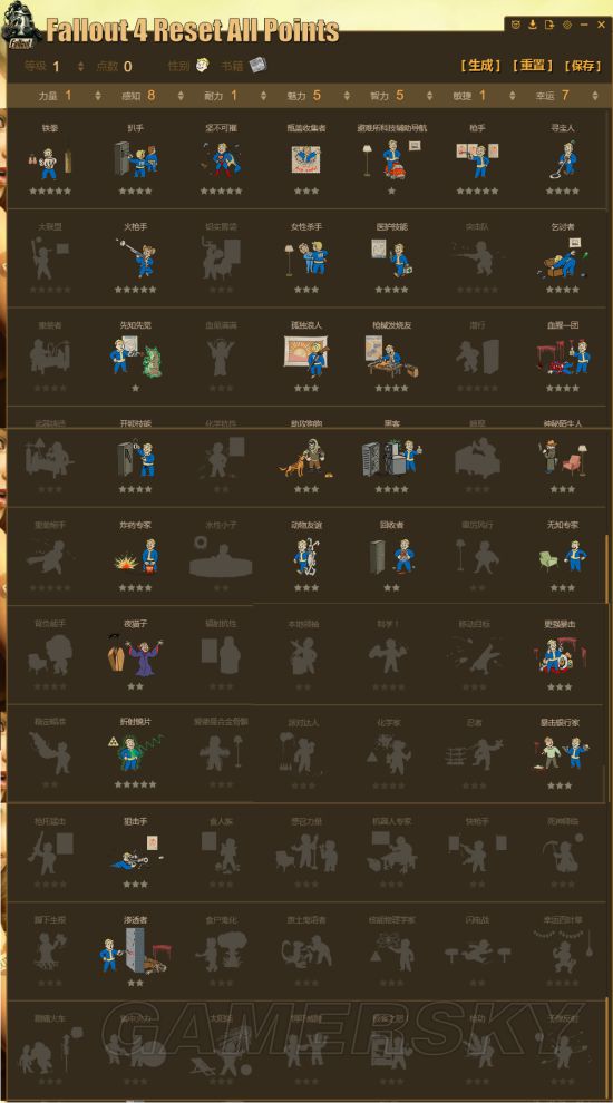 为大家分享,适用于生存难度幸运枪手流加点,由于辐射4的感知属性会关系到v模式下的命中率,所以幸运枪手流加点优势就在,高命中和武器需求较低,更适合生存难度。