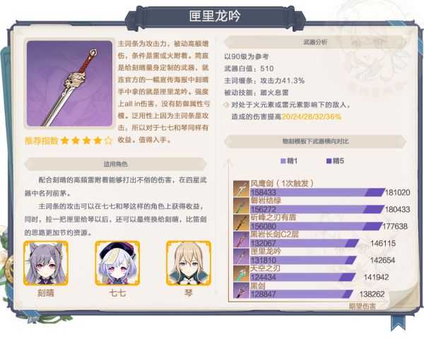 和其它“匣里”系列不同,龙吟的主词条是攻击,而非精通,即使1.6增强了聚变的伤害,攻击词条对于刻晴还是优于精通的。被动的雷火附着时增伤也比较契合刻晴的机制,对于物理刻晴同样有不错的伤害体现。