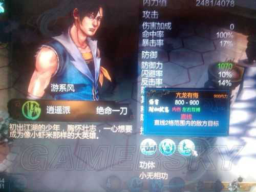 武功我起码入手了20个,我就不一一说了。最实用的就是【拜月七决】【六脉神剑】【降龙十八掌】【无极刀法】。拜月可以拉人,六脉可以推人,这两个武功可以很容易的破坏敌人阵型。比如丐帮弟子的莲花落阵,加很多防\加很多闪避,就要用这个把它们分开。降龙自带左右互搏,而且第二招第三招的左右互搏可以叠加,和侠客技的左右开弓也可以叠加,不暴击大概3000血,非常狠的功夫。无极刀第二招带左右互博,第三招加攻,持续4回合好像,每回合加的攻击力会上升,最后攻击力会加300,配合太皇,我的攻击力一下上升了450点非常强力。