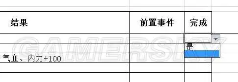 2、需手动填入的内容:一是“当前回合”(左上角第一行第二格,也就是B1单元格),格式为4位数字,第一位代表年数(1-4),第二、三位代表月份(01-12),第四位代表旬数(1-5,初上中下底),之所以不用汉字是为了方便写公式,不用游戏内的回合数是因为平时看不见嫌不够直观,不喜勿喷。最后再举个例子,第三年二月下旬,转换过来就是3024。二是已经完成的事件,请在”完成“(H列)那一格填”是“,或者该格,然后点旁边的小三角,选是。