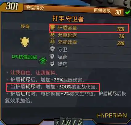 这里特别说一下,这个盾牌我有30级和50级的,选择用30级的是因为护盾容量小,容易长时间维持破盾状态从而获取300%近战伤害。这里面相对难获取的应该是这个免伤29%,100%+50%近战伤害的模组了。
