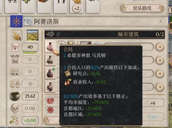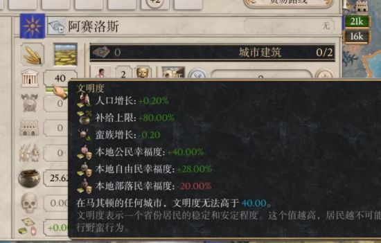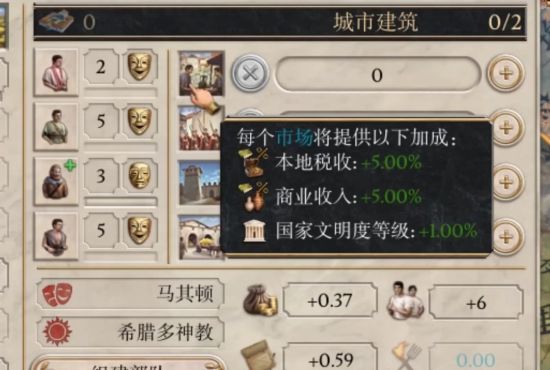 城市越大,可以建更多建筑,4大类,初期只能盖一级,有市场,军营,要塞,谷仓,市场除了税收及商业收入,最重要有加文明等级(文化程度)。