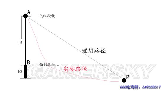 需要注意的是:在整个跳伞过程中,仅仅此时的角度Q会产生有效滑行距离(最短时间下),所以在定点于航线上的点时,角度Q产生的滑行距离应为在飞机上离目标点提前的距离。