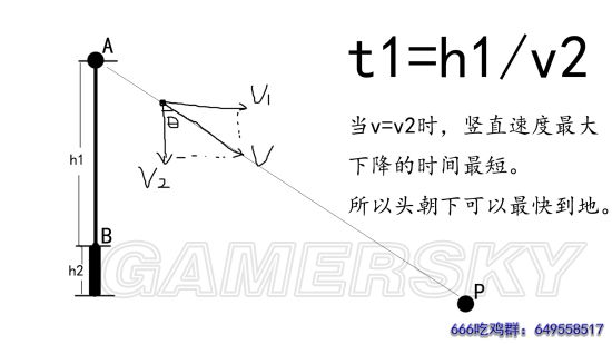 在h1的小阻力阶段中,我们要使得速度v2最大,时间t1最短,所以仅需要让我们的运行速度v=v2(这个时候水平速度v1=0),也就是竖直下落。头朝下。