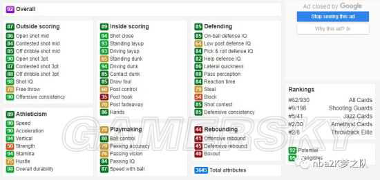 不过格里维斯也有几个明显的缺点,首先50的力量让他难以在身体对抗中取得优势,94耐力也有些不够看,80控球无法做出SB,防守也比较平庸。徽章方面,他的10个金章分别为:接球投篮手、高难度投篮手、坚韧得分手、特技演员、强力终结者、战术挡拆大师、空接达人、单人快攻、隔扣达人、挡拆闪躲者。