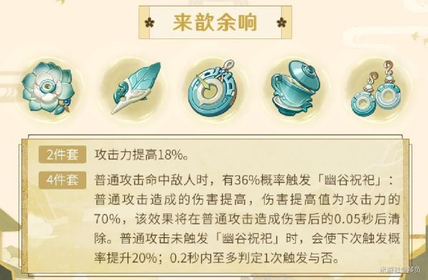 凌人开启e技能之后的瞬水剑,大概为0.35秒一次普攻伤害,可说是完美契合【余响】了,但是相比于水四,角斗士,甚至追忆套,提升并不是非常明显,比较含蓄。这一块大家可以等凌人上线后,去看专门做数值计算的帖子。总的来说就是,作为跟着凌人一起出场的专属圣遗物,它的提升相当有限,如果能找到一套其他比较极品水四或者角斗士,我个人认为没必要去刷这个【余响】。
