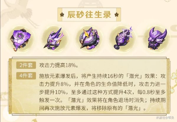 ③针对开启大招之后才能获得的效果,并且在退场之后,【潜光】效果消失,基本所有后台脱手型角色,都与这套圣遗物不搭配。