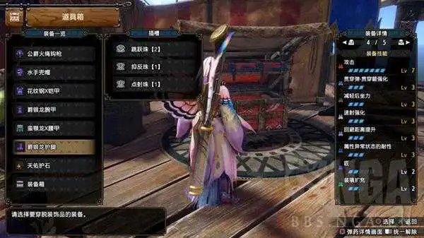 我在一个4级孔上装了个2级的回距,因为自己比较习惯拿垫步当走路用。更大众一些的话,可以改成同为4级的弹道强化2。完全按我这套来的话,对攻击距离要求会很高,需要留意。