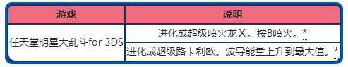 在任天堂明星大乱斗for 3DS/Wii U中,路卡利欧和喷火龙的最终绝招是超级进化。路卡利欧超级进化成超级路卡利欧,此时它的波导一直是最大值。喷火龙超级进化超级喷火龙X,此时它的速度得到提升,并且可以无限次数跳跃,招式也发生了变化。超级进化状态具有减免击退效果,但只是暂时变身效果,受到伤害会加速超级进化状态消失。