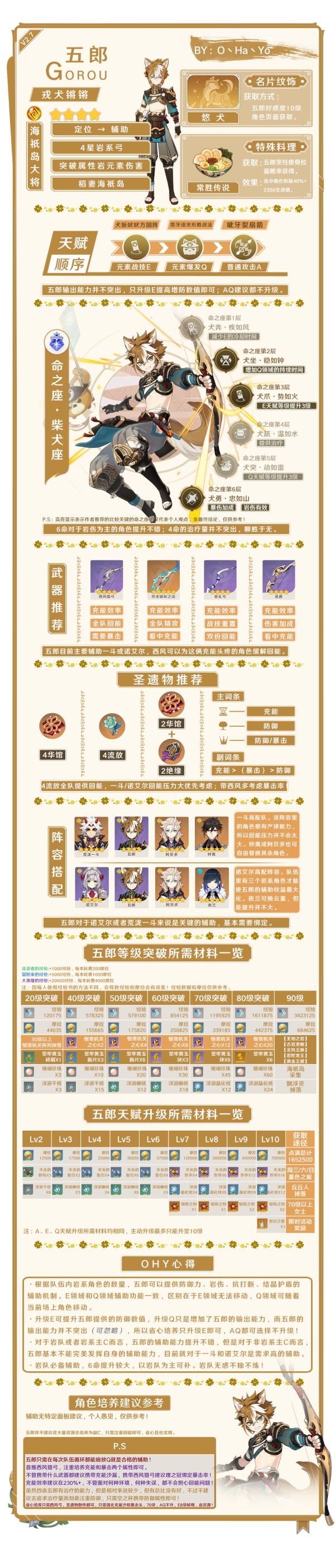 不要想着用五郎输出,费时费力又不讨好,使劲发挥五郎的辅助功能就是最棒的。诺艾尔/一斗回能有压力?没问题,交给五郎吧,西风弓产球给你,4流放开Q给你回能。需要防御来增攻,需要岩伤?没问题,交给五郎吧。你看多好的一个辅助。