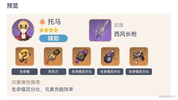 托马配装以生命充能为主,个人推荐西风长枪生生生,千岩绝缘2+2。