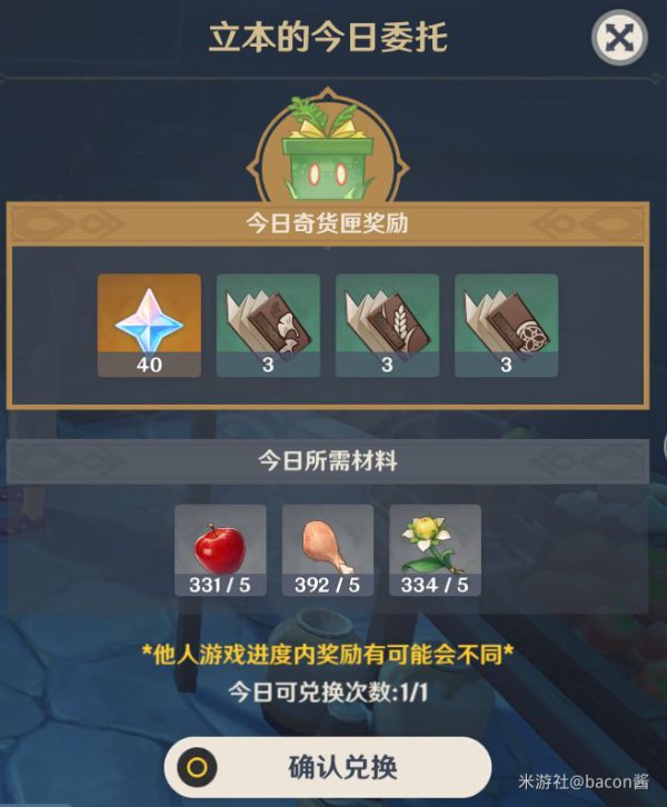 询问【立本】今日的【兑换材料】种类