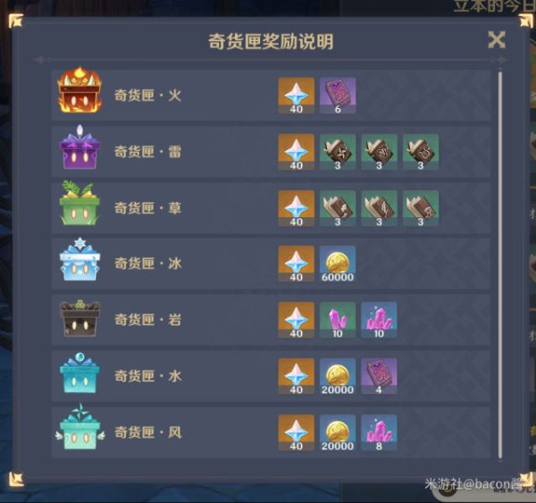 冰奇货匣 >火奇货匣 =水奇货匣>雷奇货匣 =草奇货匣>风奇货匣>岩奇货匣