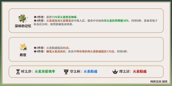 由于“草元素克制水元素”,在双草阵容中,大多数情况下是可以保持敌人处于“草底”(即草元素附着)下的,这就使得想要提高绽放反应的伤害,则需要队内的水元素角色主堆叠元素精通。