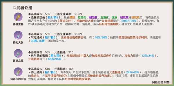 ④.除了能够提供元素充能效率的武器外,当其圣遗物的充能效率足够时,也可考虑选择各种元素精通副属性的武器(玛海菈的水色、雨裁、饰铁之花等),以提高卡维站场时的治疗能力。