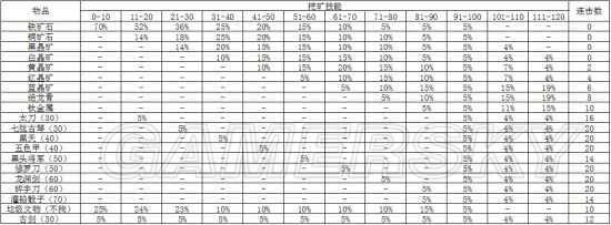 各类矿石及木箱的出现几率是用0,0,1,0,0,0,0,0,0,1,1,1这样一串12个数字表示的。考虑到挖矿技能最高能达到120,很自然地想到这串数字或许是指矿石和木箱在每10点挖矿技能的分段分布。经过多次测试,基本上确定了上表的分段方式。至于每个阶段各种物品出现的几率,是直接将该段所有对应数字加总作为分母除出来的,这个要验证需要的测试量太大,我只能说目前有限的测试数据基本上符合理论数据。实际上我们也不大需要每种物品出现的精确几率,只需要知道当前挖矿技能下能挖到哪些物品就足够了。