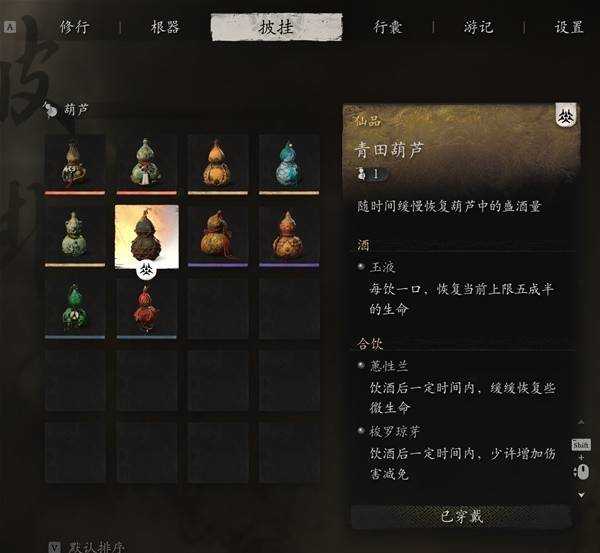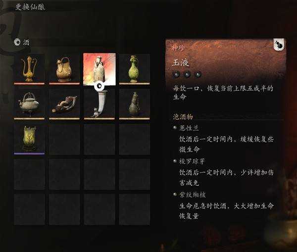 葫芦选青田,酒选玉液,泡酒物:梭罗琼芽、慧性兰(可换第二个梭罗)、紫纹缃核。