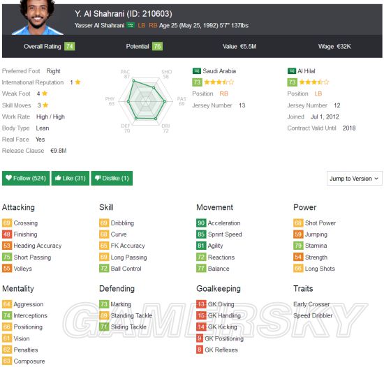 在沙特阵中的明星后卫亚斯-阿尔是后防万金油,沙特打进世界杯凭借着就是超强的防守能力,而这稳定的防线最出彩的就是亚斯尔-阿尔。亚斯尔-阿尔不仅可以踢中后卫,即使是作为边后卫也有不俗的速度和对抗能力。在FIFA 18中,这张亚斯尔-阿尔有着超快的双速,强壮和体力十分充沛,而且最重要的是如果作为边后卫模型是绝对不输任何明星后卫的,但总评74还是证明了这张卡有缺陷的。