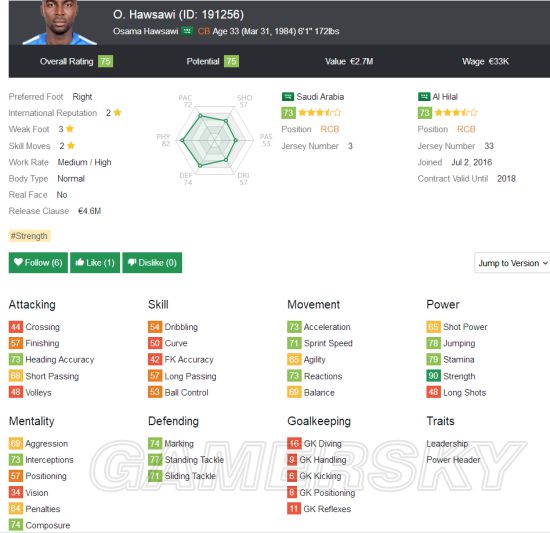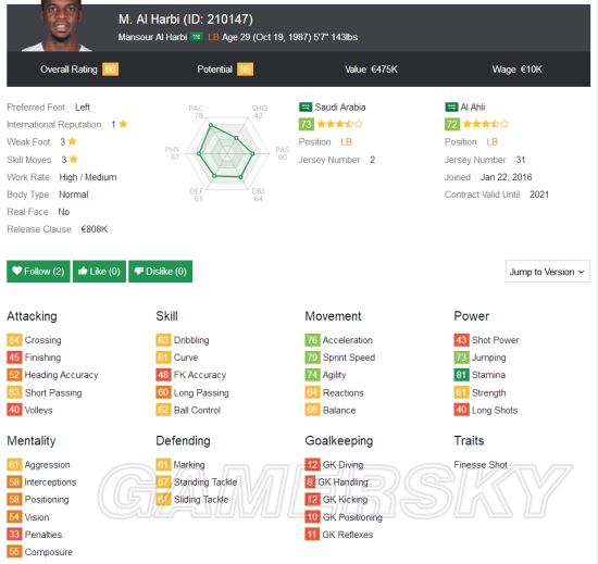 沙特队中作为精神领袖的贾西姆曾经给中国队留下过深刻的记忆,而作为最年长的球员,传球稳健,直塞靠谱,是沙特队的进攻发动机,但是体力一般、防守羸弱,在实战中更多的作为精神领袖。FIFA 18中贾西姆表现的淋漓尽致,手感只能是勉强及格,除了传球稍有提升外并无其他特点,或者说这张卡还是比较全面的。