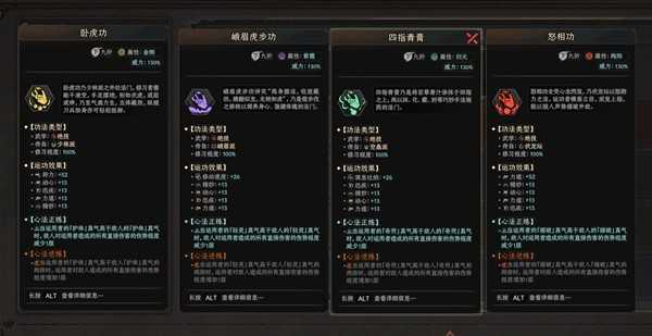 首先什么是挂件 即内功、护体、绝技这些只要运转就会有属性加成和特效的武功。