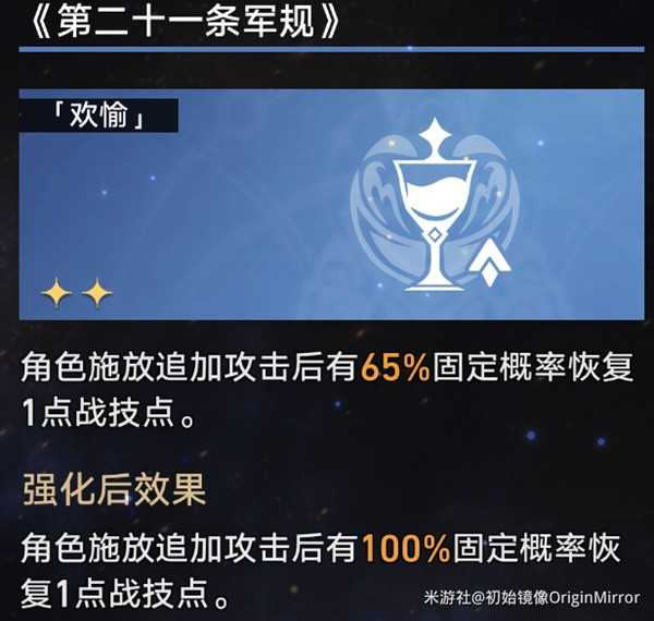 《第二十一条军规》看到必选,能极大程度缓解景元队伍中战技点需求问题,甚至能引进每回合都要吃战技点的布洛妮娅,另一个祝福补充一定的控制效果。