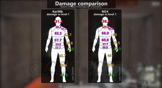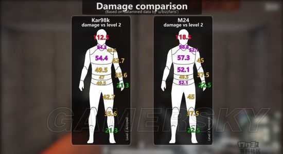 可以看到,尽管在数值上有一定的区别,但从伤害范围来看两把武器的区别其实并不是很明显---只要命中脖子以上,那么肯定就能够一枪把对手干掉。而如果目标装备了一级甲,此时M24的优点就凸显出来了:至少它能够保证你在没有打中头部而是颈部的情况下照样干掉目标,而此时的98k就无法达到这个效果。