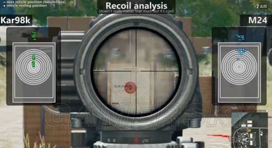 从对比我们可以看出两把武器在后坐力方面有着明显的区别。98k显然更加稳定,在水平方向上的晃动几乎不存在,但M24就明显分散得多,意味着这把武器虽然伤害更高,但玩家在进行连续射击时更加需要重视瞄准时的控制。
