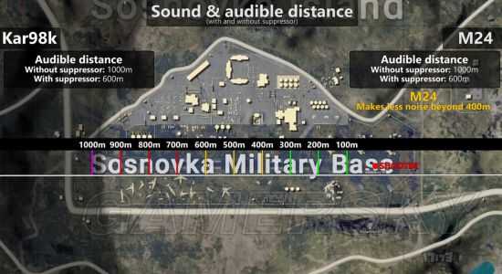 对于M24是什么样的情况呢?答案依然是相同的,即没有装备抑制器为1000米,装备了抑制器为600米。不过值得一提的是,M24在距离超过400米后声音衰减的程度要高于98k,也就是说在400米开外的地方,M24的声音会更小一些。