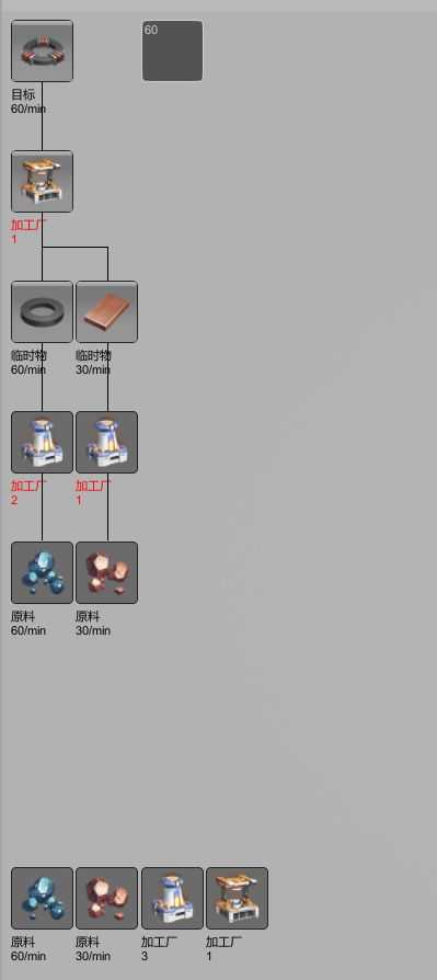 比方说我们想要生产60/min的磁线圈,那么原料方面就需要60/min的磁铁+30/min的铜块。磁铁和铜块所需要的原料可以进一步推算出来。 工厂数量的推算稍复杂,但过程类似。