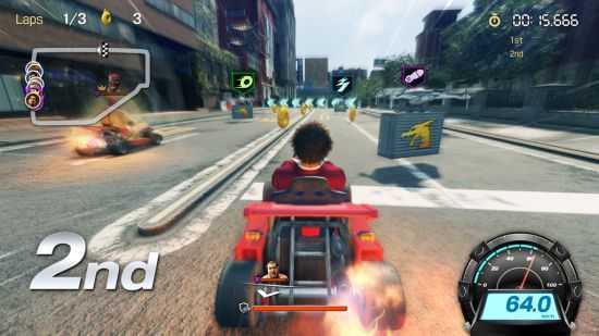 赛道上有许多道具箱。除了加速道具,还有机会获得火箭筒或加特林机枪等攻击道具。用这些道具把对手的赛车轰到崩溃,一口气甩开他们!