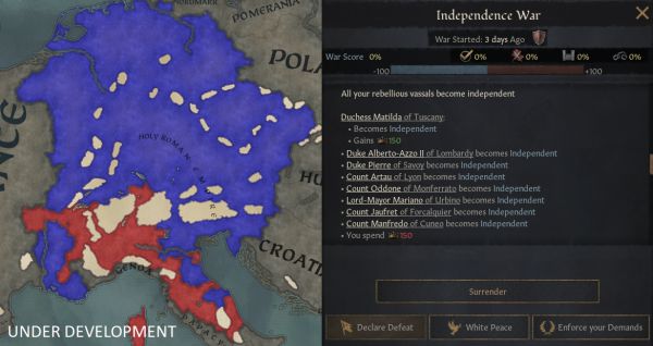 与前作类似,CK3中,在对现状不满的附庸会成立派系。足够强大的派系会向领主发出最后通牒,要求领主妥协或开战。