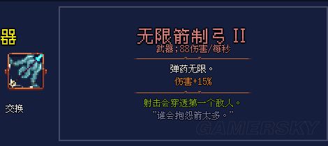 比如无限箭制弓的特性就是“弹药无限”,意味着他不需要弹药补充,